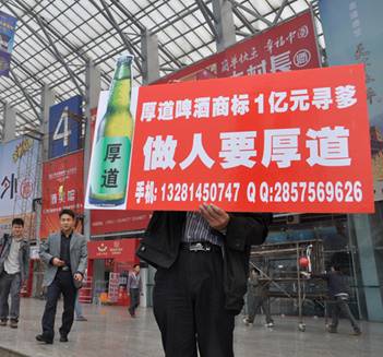 近日,成都正在舉辦春季全國糖酒會(huì)之時(shí),一位男士高舉著“厚道啤酒商標(biāo) 1億元尋爹”廣告牌,引來眾人圍觀。有市民拍下照片上傳至微博,立刻吸引了眾多網(wǎng)友關(guān)注,短短幾個(gè)小時(shí)評(píng)論和轉(zhuǎn)發(fā)達(dá)上千條。