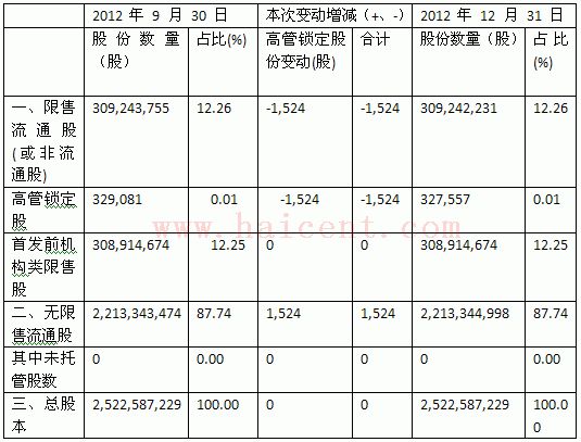 三、前十名股東持股情況(截至 2012 年 12 月 31 日)