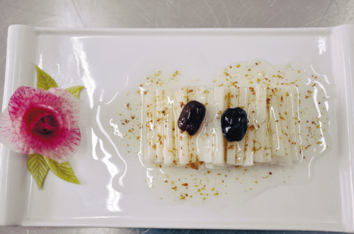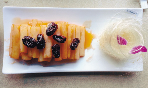 “這道菜叫桂花養(yǎng)生山藥,是道名菜。”青年打荷工表示。