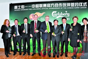 丹麥駐中國大使館副館長公使銜參贊姚朔仁(Soren Jacobsen)、中國足協副主席于洪臣、“嘉士伯中國”首席執行官馬儒超(Stephen Maher)等各方代表出席了簽約儀式。這是繼2012年連續7屆贊助歐洲杯、2013年開始成為英超官方啤酒后,嘉士伯再度“擁抱”足球賽事,該著名品牌全力支持中超及英超這兩個在中國最多人次收看的足球聯賽。