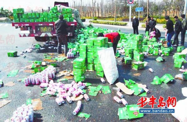 半島都市報4月7日訊(記者 徐杰 林剛 ) 7日下午2時許,在嶗山區濱海大道與金水路路口發生一起意外事故,一輛拉滿罐裝啤酒的大貨車,在拐彎時由于車速太快,車上的1500余箱啤酒頃刻間甩出,破碎的啤酒浸濕了路面,路口也散發著濃濃的酒味。據了解,滿滿一車3000箱啤酒剛從嶗山的工廠運出,準備送往溫州銷售。見不少市民圍觀,車主還大方地讓圍觀者品嘗“破相”的啤酒。