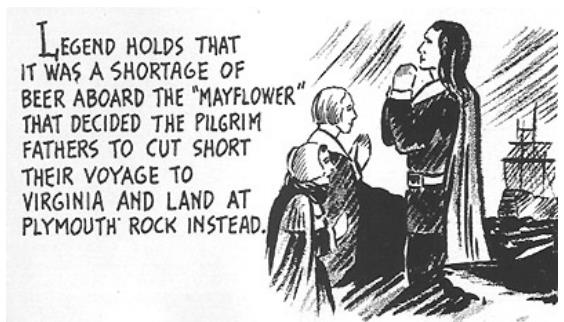 《華盛頓郵報》1983年的一篇經典文章中曾報道:著名的“五月花”號船滿載不堪忍受英國國內宗教迫害的清教徒102人于美洲普利茅斯巖登陸,饑寒交迫之際印第安人送來了生活必需品并教會他們狩獵和種植,1621年11月下旬的星期四,在豐收的季節,人們為感謝印第安人的真誠幫助,共同慶祝美國歷史上第一個感恩節。而事實上,“五月花”原定在北維吉尼亞登陸,之所以漂流至此,是因為天氣惡劣、航海技術較差、食物供給不足,根據很多歷史學家,和對這個偉大時刻的很多記載表明,當時真正供給不足的食物正是啤酒。
