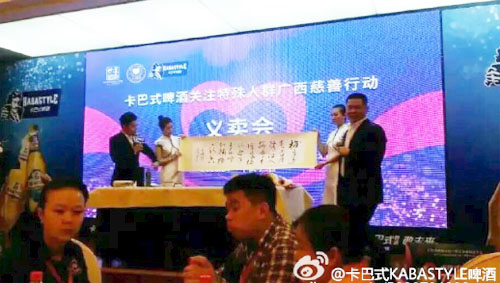 2016年4月29日下午,卡巴式啤酒關(guān)注特殊人群慈善行動(dòng)暨進(jìn)駐廣西市場(chǎng)新聞發(fā)布會(huì)。會(huì)上,卡巴式啤酒開展義賣活動(dòng),不少的人士以買啤酒的形式獻(xiàn)上自己的愛心,短短幾分鐘,7700瓶啤酒便銷售一空。本次慈善行動(dòng)還邀請(qǐng)了著名書法家雪山先生,現(xiàn)場(chǎng)以書法義賣的形式,為廣西的特殊人群籌集善款。本次活動(dòng)共籌集善款51000元,現(xiàn)場(chǎng)捐贈(zèng)給廣西慈善總會(huì),用于幫助聾啞人群和邊緣群體。