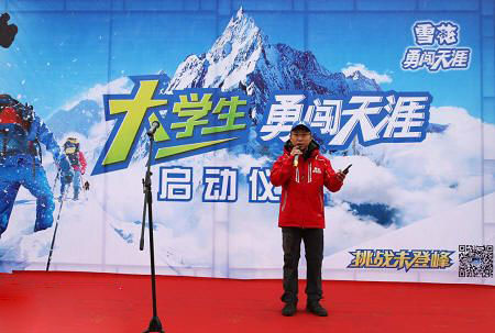 5月25日啟動儀式上,26名大學生勇士成為閃亮的主角。他們莊嚴宣誓: 秉乘“進取、挑戰、創新”的勇闖精神,團結合作,直面未知,勇敢挑戰,永不言棄!出席此次啟動儀式的華潤雪花品牌總監閻東表達了熱忱的希冀和堅定的信心,并希望“勇闖”精神能夠鼓勵未來的社會棟梁們突破自我、勇敢前行。將雪花大學生勇闖天涯挑戰未登峰帶給大學生們的精神傳遞給身邊每一個積極向上的伙伴。隨后,授旗儀式開始,本次活動領隊牛亞萍親自將“勇闖天涯”的旗幟交到代表隊員的手上。在接過隊旗、莊嚴宣誓之后,勇士們在轟鳴的禮炮聲中向大本營進發。