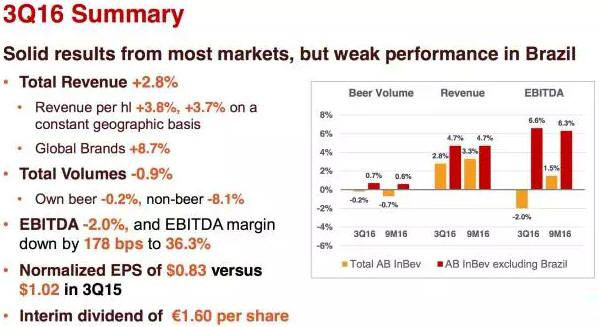 季報顯示,百威英博公司第三季度營收增長2.8%,前九個月增長3.3%;第三季度銷量下降0.9%,前九個月共下降1