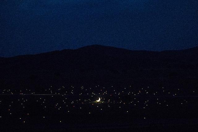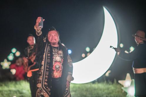 晚上7點左右,太陽隱入地平線,廣袤的草原被夜色籠罩。上千顆散落在地上的“星星”和“月亮”一齊亮起。草原秒變“星空”,遠遠看去,仿佛夜空倒影在大地上。一群草原漢子跨上哈雷,騎上駿馬,載著星星燈,聲勢浩蕩地穿過星星月亮裝置,像流星飛速劃過大地,一場前所未見的草原流星雨就在眼前下了起來。