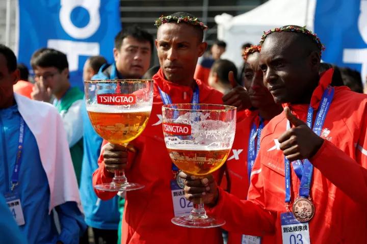 在今天的優(yōu)勝選手頒獎(jiǎng)環(huán)節(jié),青島啤酒股份有限公司黨委副書(shū)記、工會(huì)主席于嘉平先生特別將3杯40厘米高、裝滿(mǎn)了新鮮啤酒的“冠軍杯”頒給了冠軍阿巴扎維、來(lái)自埃塞俄比亞的亞軍選手Zelalem Desalegn Tilaye,以及來(lái)自肯尼亞的季軍選手MianoVictor wachira,并與他們一起在頒獎(jiǎng)臺(tái)上舉杯暢飲。