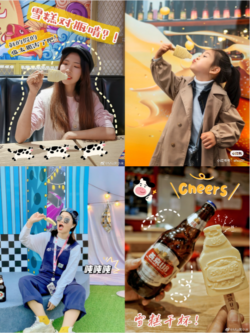 特別是“對瓶啃”的口號,與啤酒“對瓶吹”的動作結合,將吃雪糕的動作趣味化、具象化,購買到雪糕的消費者紛紛拍照打卡,掀起傳播熱潮。