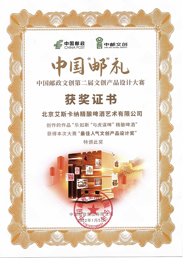 1月5日上午,由中國郵政集團有限公司主辦,北京郵票廠有限公司承辦的中國“郵”禮中國郵政文創第二屆文創產品設計大賽頒獎典禮,在中國國家博物館舉辦。北京艾斯卡納精釀啤酒藝術有限公司提報的參賽作品樂如斯“與虎謀啤”精釀啤酒,榮獲本屆大賽“最佳人氣文創產品設計獎”并受邀參與頒獎典禮,活動現場中國郵政領導為領獎代表頒發榮譽證書。