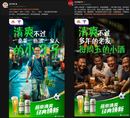 先來看線上,燕京以微博為主陣地打出“經典啤酒+回憶情緒”的組合拳。從7月15日起,燕京啤酒微博和北京晚報微博同步發布清爽專題情懷系列海報,以三五好友相聚等百姓生活為切入點,以#煥新出發,有你更清爽#為話題,以北京晚報為矩陣鏈接北京消費者的燕京清爽回憶,喚醒清爽陪伴北京人的這些年,在老北京街頭巷尾留下的、獨具煙火氣的“清爽記憶”,時代的變遷下依舊是熟悉的味道。也向大眾傳遞出“燕京清爽煥新迭代的是包裝,不變的是味道”的信息。
