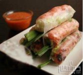 配料: 1、3大湯匙加州無(wú)籽葡萄,切成兩半,任何顏色的葡萄均可 2、1張直徑為8英寸的米紙, 3、3片芫荽葉 4、2大湯匙煮熟的鮮蝦 5、1大湯匙胡蘿卜,切絲或切碎 6、2大湯匙綠色甘藍(lán),切成薄絲 7、2大湯匙豆芽 8、2大湯匙煮熟的冬粉條 9、1大湯匙新鮮的薄荷葉,撕碎 制作