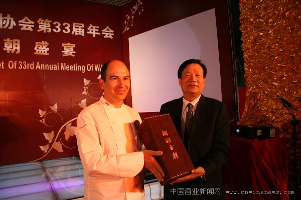 天津市副市長李文喜向世界名廚協會輪值主席Mr Ulrich KERZ贈送王朝梅露輒干紅葡萄酒