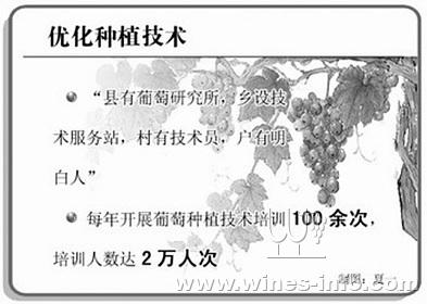 在葡萄酒生產行業,流傳著這樣一句行話“最好的葡萄酒,七分靠種植,三分在釀造”,除了擴大葡萄種植面積,懷來縣還采取了一系列強化服務的措施,在葡萄選種和標準化生產上下功夫,為生產優質葡萄酒打下質量基礎。