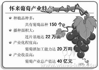 通過深度調查,記者總結出懷來葡萄產業的4個特點:種植品種多,共有鮮食專用、釀酒專用、鮮食釀酒兼用葡萄品種150個;播種面積大,僅連片基地就達22萬畝,葡萄產區農民人均達到2畝多;產業化程度高,該縣共有葡萄加工企業27家,葡萄酒加工能力達到20萬噸,遠銷世界20多個國家和地區;產業收益高,全縣葡萄產業總產值達到40億元,財政收入的三分之一來源于葡萄產業。