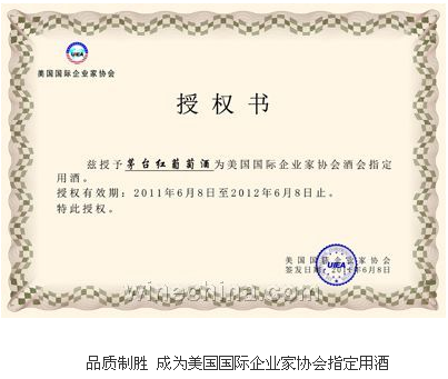 今年6月8日,茅臺葡萄酒被美國國際企業家協會授予茅臺葡萄酒為該協會唯一指定葡萄酒產品。該協會認為茅臺