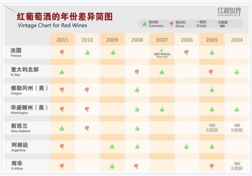 一位葡萄酒專家要是手中或心中沒有一幅葡萄酒的年份差異圖,那是相當丟份兒的。因為一幅簡單的年份差異圖能告訴你某個國家某個產區某個葡萄園以及某個葡萄品種在不同年份的不同表現,所以愛酒的你也應該有一幅這樣的圖表深藏于心。上面的這張簡圖列出2004-2011年間意大利北部、法國、俄勒岡州(美)、華盛頓州(美)、南非、新西蘭以及阿根廷出產的紅葡萄酒的年份差異圖。