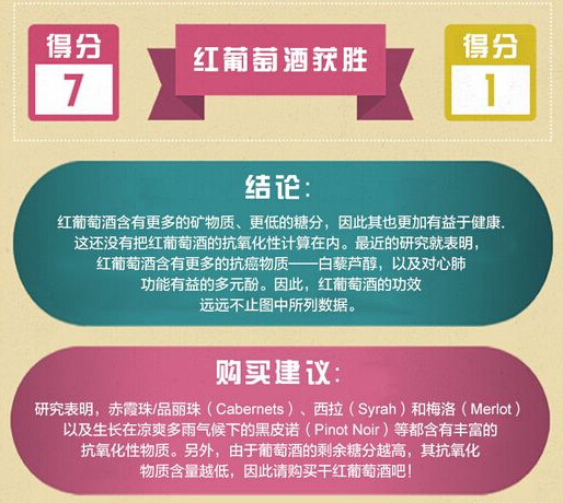 從熱量和碳水化合物來看,紅白葡萄酒都相差無幾;而紅葡萄酒的天然糖分一般都比白葡萄酒更低;至于礦物元素如鐵、鎂、磷、鉀等,紅葡萄酒都全面超過白葡萄酒;而像類胡蘿卜素、膽素這些對心腦血管有利的微量物質,紅葡萄酒的含量也高于白葡萄酒。因此,從多方面來看,紅葡萄酒對人體都是有利的,當然是在適量飲酒的情況下。