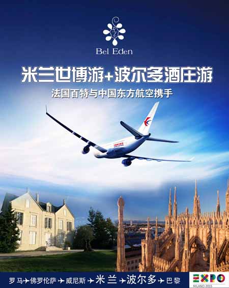 今年恰逢世博會在意大利米蘭舉辦,東方航空將為百特的近百位客戶提供為期11天9晚的米蘭世博游+波爾多百特酒莊游,依次去往羅馬、佛羅倫薩、威尼斯、米蘭、波爾多、巴黎,跨越意法兩國,在米蘭游歷正值火熱的世博會,感受意大利的古老底蘊,在波爾多參觀包括百特旗下巴亞圖酒莊和拉復酒莊在內的多家名莊,品嘗世界最頂級的葡萄美酒。