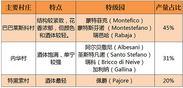 將巴巴萊斯科的主要村莊、特級葡萄園、葡萄酒特點和各村產量占比匯總如下: