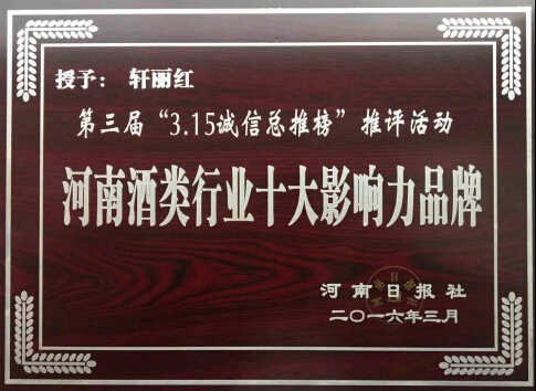 豐澳·軒麗紅在“第三屆3.15誠信總推榜”活動中,榮獲“河南省酒類行業十大影響力品牌”,這是豐澳·軒麗紅在發展自主品牌征程中的重要里程碑。