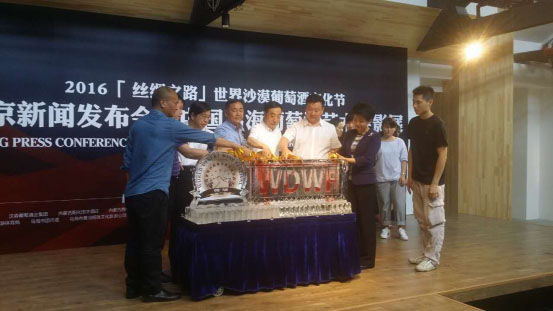 發布會尾聲由內蒙古自治區貿促會會長劉廷山、烏海市人民政府市長史萬鈞、烏海市委常委宣傳部長王曉平、烏海市人民政府副市長冀曉青、中國葡萄酒專家郭松泉、新華網食品頻道主編楊玉云、以及釀酒大師藝術館(MIBA)館長寧小剛,將葡萄酒緩緩注入刻有“2016『絲綢之路』世界沙漠葡萄酒文化節”主題的冰雕中,正式開啟“2016『絲綢之路』世界沙漠葡萄酒文化節”。