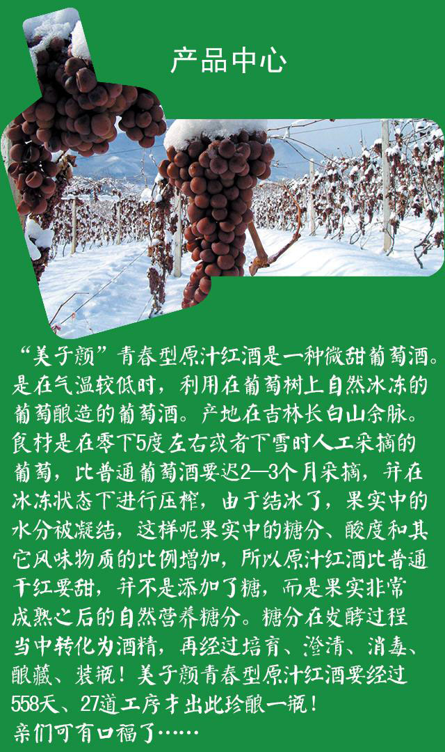 美子顏原汁紅葡萄酒原料葡萄產自長白山鴨綠江流域的通化地區,酒莊葡萄園位于距通化60公里的鴨綠江河谷地區,葡萄園四面環山,臨近鴨綠江畔,處于長白山綠色森林懷抱中,方圓200公里內沒有大的工業,森林覆蓋率超過95%。葡萄酒采用的品種為長白山野生山葡萄品種的改良品種北冰紅,該品種源自長白山野生山葡萄,具有山葡萄與生俱有的抗病、抗寒、營養保健物質含量高的特點,該品種花青素含量居于世界葡萄品種之首,保健價值非常高。本品的生產工藝采用傳統的壓榨方法,為最大限度保證花青素含量,采用葡萄籽、皮與汁共同發酵等特有工藝,使產品中最大限度含有葡萄籽皮保健成分花青素。經吉林省物理化測試中心及國家葡萄酒檢驗中心測定,葡萄酒含量最高每毫升可達10-30mg。