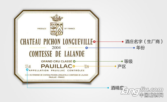 這個信息非常關鍵,基本上可以告訴你葡萄酒的質量。在波爾多,酒莊是葡萄酒質量的最可靠指標。1855年,波爾多對各個酒莊進行分級,其中有63家被評為“列級酒莊”(Grand Cru Classe)。63家列級莊當中,只有4家榮登“一級酒莊”寶座,即拉菲古堡(Chateau Lafite Rothschild)、拉圖酒莊(Chateau Latour)、瑪歌酒莊(Chateau Margaux)和侯伯王酒莊(Chateau Haut-Brion);1974年,木桐酒莊(Chateau Mouton Rothschild)也加入了一級酒莊之列。