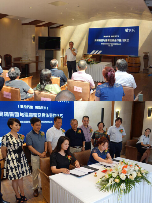 2017年8月9日10:58分昊樽集團與瀛寰寶奇在集團旗下萊品酒窖正式簽署戰略合作協議。昊樽集團總裁余閩先生、瀛寰寶奇董事長田仲文先生、昊樽集團副總裁及睿雨佳釀總經理程麗女士以及瀛寰寶奇總經理王偉珍女士共同參加了此次簽約儀式。