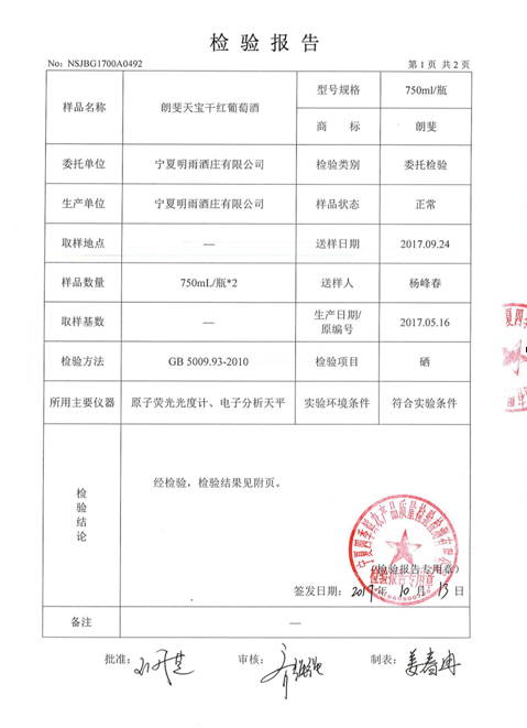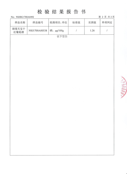 據檢測,朗斐天寶干紅硒含量檢測報告為1.26ug/100g,也就是說,每瓶朗斐天寶干紅(750ml)的含硒量高達 9.45ug ,可謂是富硒葡萄酒、富含“長壽元素”的長壽之酒。