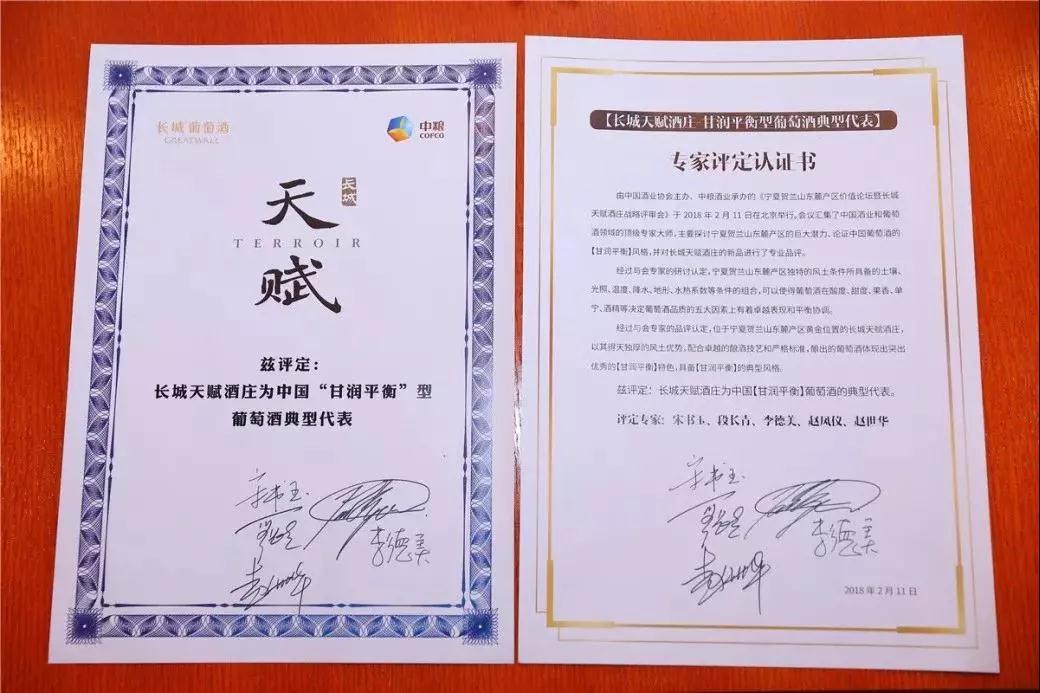 長城天賦酒莊是中國“甘潤平衡”型葡萄酒典型代表認證書