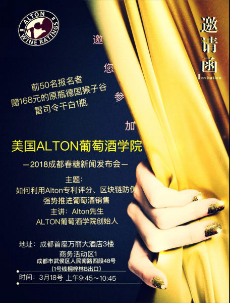 新聞發布會將在3月18日早上,首座萬麗酒店3樓舉行,屆時展示詳細的人工智能評分系統、區塊鏈加密的葡萄酒溯源和防偽,演示Alton評分系統的APP。Alton機器人葡萄酒整體評分、Alton區塊鏈防偽,雙管齊下,將力助酒商,強勢推進葡萄酒銷售,精彩紛呈,不容錯過。