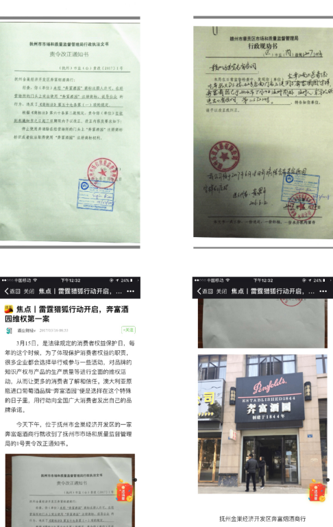 (特別備注:上圖為2017年奔富酒園雷霆獵狐侵權打擊專項行動當地政府的市場監督管理局對一些已經涉嫌侵權的商家執行行政整改處罰文件和媒體報道的案例)