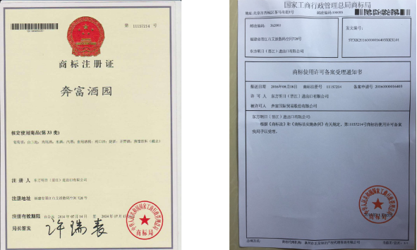 作為一個在上海股權托管交易易中心掛牌上市的公眾公司,奔富國際貿易易股份有限公司(簡稱奔富股份,股權代碼為210673)是第11157214號“奔富酒園”和第11081167號、第11011938號“RUSHRICH”等商標的獨家授權使用人。商標持有人已經將這些相關商標的合法使用權通過授權和備案等方式移交給奔富股份,并且按照國家商標法的要求,正式獲得國家工商行政管理總局商標局的備案受理通過。這也意味著,奔富股份從商標持有人手中正式接過了了“奔富酒園”等商標的獨家使用權,奔富股份作為“奔富酒園”等注冊商標在中國的獨家使用授權單位已經受到法律的保護,任何侵犯“奔富酒園”注冊商標的行為將受到法律的制裁。