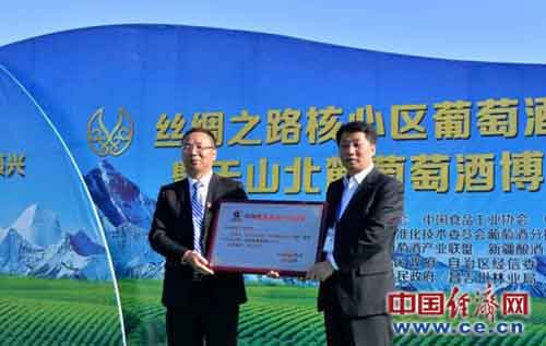 中國酒業協會常務副理事長王琦向瑪納斯縣政府授牌,李春林常務縣長接牌