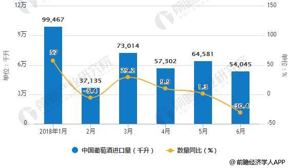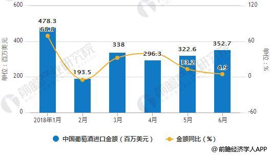 據(jù)前瞻產(chǎn)業(yè)研究院發(fā)布的《葡萄酒行業(yè)市場需求預測與投資戰(zhàn)略規(guī)劃分析報告》統(tǒng)計數(shù)據(jù)顯示,2018年6月,我國葡萄酒進口量為54045千升,同比下降30.4%;2018年1-6月,我國葡萄酒進口量為385436千升,同比增長25.8%。在進口金額方面,2018年6月我國葡萄酒進口額為352.7百萬美元,同比增長4.9%。2018年1-6月,我國葡萄酒進口金額為1981百萬美元,同比增長9.3%。預計到2021年,中國葡萄酒市場規(guī)模有望達到230億美元,取代英國成為僅次于美國的第二大葡萄酒市場。