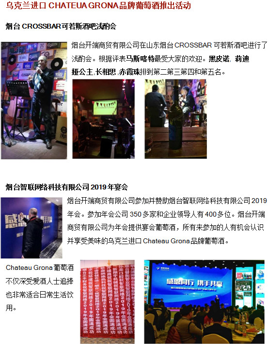 2018年10月起,煙臺開端商貿(mào)有限公司向中國市場推廣的烏克蘭天然葡萄酒項目,不少的高品質(zhì)葡萄酒愛好者能對煙臺開端商貿(mào)有限公司推出新產(chǎn)品 – 烏克蘭進口 CHATEUA GRONA 品牌葡萄酒給予肯定。