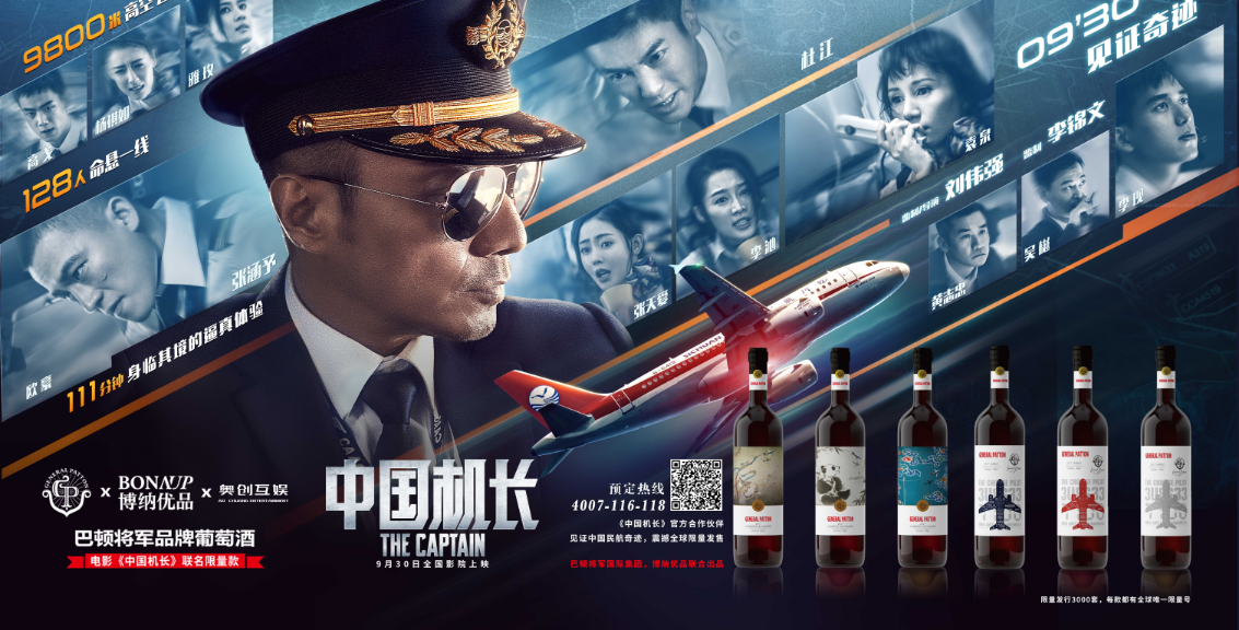 由博納影業出品,著名導演劉偉強執導,演員張涵予、歐豪、杜江、袁泉、張天愛、李沁等主演的獻禮電影《中國機長》將于9月30日全國公映,萬米高空的飛機駕駛艙風擋玻璃突然爆裂脫落,機艙瞬間冷如冰窖,乘客驚恐萬狀亂作一團,生死關頭,一位偉大的中國機長力挽狂瀾,保住了全機128人的性命!驚心動魄、驚險刺激的情節將為觀眾帶來一次震撼心靈的視聽盛宴!作為進口紅酒極具競爭力的品牌,巴頓將軍國際集團旗下的巴頓將軍葡萄酒,憑借其優異的口感和高雅格調的形象在眾多品牌中脫穎而出,成為電影《中國機長》官方指定紅酒合作品牌,將為觀眾朋友帶來一場前所未有的味覺盛宴!