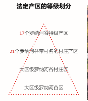 羅納河谷區(qū)的葡萄酒分級(jí)呈現(xiàn)金字塔形,自下到上分別是:大區(qū)級(jí)羅納河谷區(qū)、大區(qū)級(jí)羅納河谷村莊區(qū),羅納河谷帶村莊名字的村莊產(chǎn)區(qū),羅納河谷特級(jí)產(chǎn)區(qū)。