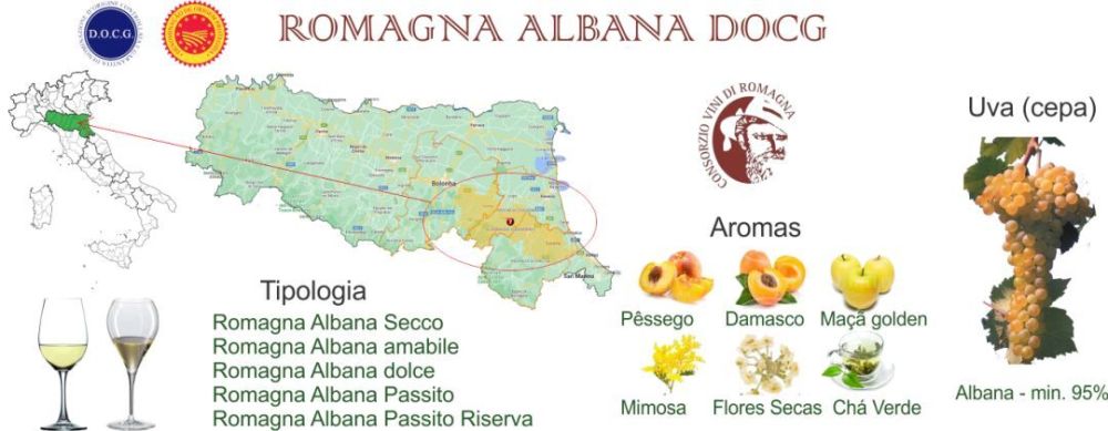 Romagna Albana DOCG 在1987年被升格為 DOCG,法規要求使用至少95%的 Albana 葡萄。產地從亞平寧山脈的博洛尼亞往東一直延伸到亞得里亞海,跨越山麓的起伏地貌形成了多種微氣候,為葡萄種植提供了理想的地形。