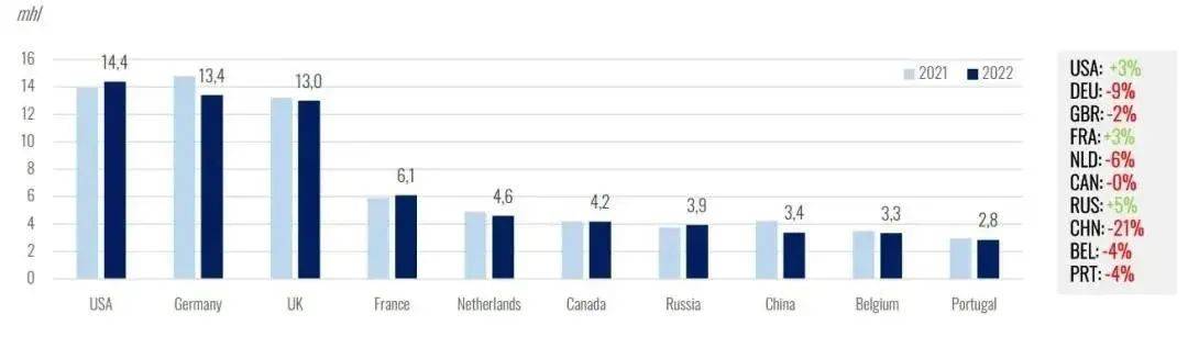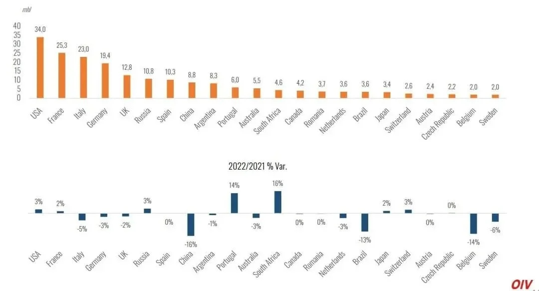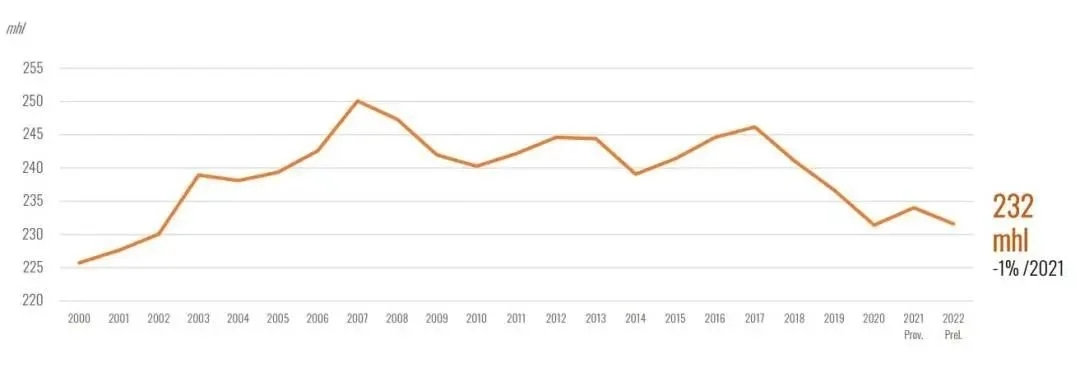 2022年全球葡萄酒消費量估算為232億升,較2021年下降了1%。