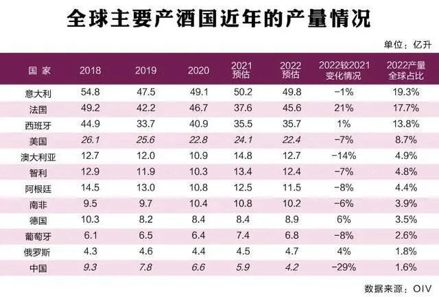 2018年至今,中國葡萄酒產量從9.3億升下降為4.2億升,下降幅度已超過50%。