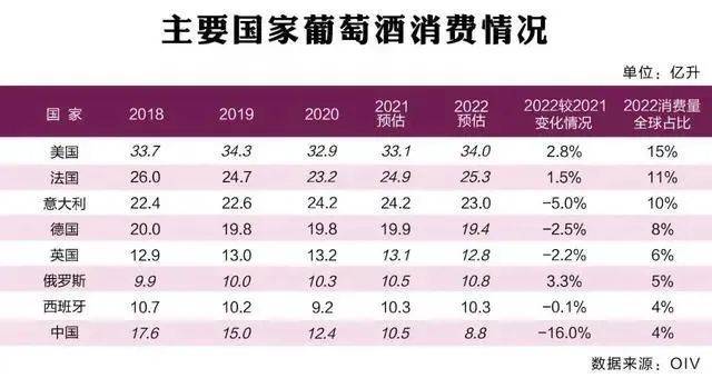 到2022年,消費量已從17.6億升下降到8.8億升,完全腰斬,也是全球主要葡萄酒消費國下滑幅度最大的。