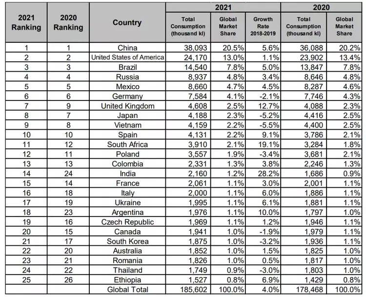 2021年全球各國啤酒消費量排行榜顯示,大部分國家啤酒消費者保持增長