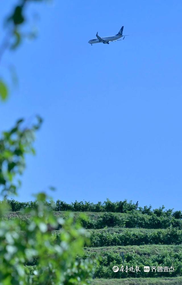 瓏岱酒莊葡萄園梯田的上空,有飛機飛過。(齊魯晚報·齊魯壹點記者 劉軍 攝)