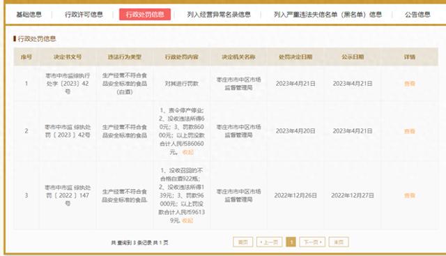 此外,國家企業信用信息公示系統還顯示,東帝豪酒業有限公司存在2條關于生產經營不符合食品安全標準食品的歷史行政處罰信息。2022年12月26日,該公司被棗莊市市中區市場監督管理局沒收召回不合格白酒922瓶,沒收違法所得139元并罰款96000元,罰沒款合計人民幣96139元;2023年4月20日,被棗莊市市中區市場監督管理局責令停產停業,沒收違法所得60元并罰款86000元,罰沒款合計人民幣86060元。