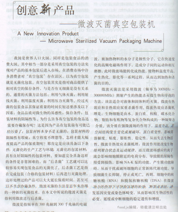 首頁 > 糖酒科技 > 包裝機械 > 包裝機械 微波滅菌真空包裝機 中國食品機械設備網 2010-05-20 11:32 包裝機械 我國是世界人口大國,同樣是包裝食品放入消費大國。其中相當一部分是采用 真空包裝 的方法實現對產品的基 我國是世界人口大國,同樣是包裝食品放入消費大國。其中相當一部分是采用真空包裝的方法實現對產品的基本包裝后進入市場。 上一篇中國食品和包裝機械情況2009年以來,在國際金融危機的沖擊下,我國食品和包裝機械行業出口出現了近年來的首次下降 上一篇為技術埋單是物有所值伴隨著食品價格高漲,同時又意識到產品需要更健康一些的食材搭配,更有家庭制作感覺,快餐生產商們堅定地把 相關文章 瓶裝水包裝未來怎么變 飲品、乳品、調味品包裝全分類 白酒包裝的四大趨勢 北京紅星股份李東升建議:白酒瓷瓶包裝該限制 全程可控的智能回收網絡避免飲料包裝物二次污 茶葉包裝倡導“低碳” 微波設備企業要緊隨互聯網時代的步伐 葡萄酒包裝:木制酒盒最具競爭力 包裝機械類型大盤點 月餅過度包裝 將面臨召回風險
