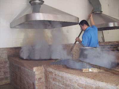 在山東即墨黃酒廠,還保留著原始的釀造黃酒的整套設備和程序,它不僅向人們展示了中國傳統黃酒的釀造過程和歷史,也成為即墨黃酒廠的一道景觀,引起了參觀者的極大興趣。圖為工人正在用原始的方法炒制釀酒原料。