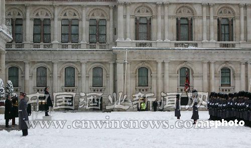 倫敦當(dāng)?shù)貢r間二月二日上午八時三十分許,中國總理溫家寶在英國外交部出席布朗首相舉行的歡迎儀式。前夜,倫敦版權(quán)中國酒業(yè)新聞網(wǎng)突然迎來近十七年來最大的一次降雪。圖為溫家寶在檢閱臺上檢閱在雪地中列隊的英國儀仗隊。中新社發(fā)張朔 攝