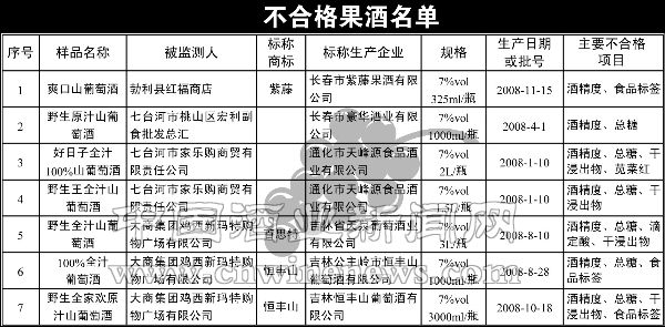 通過質量監測,發現果酒存文章來源:cnwinenews.com在以下問題:一是酒精度,7批次不合格品的酒精度項目全部不合格,酒精度標簽明示7%vol,實測值全部低于3.5%vol,最低為0;二是總糖,6批次不合格,實測值均小于3.5g/L,有一個批次標明≥50g/L,實測為0;三是干浸出物,此含量是間接衡量果汁含量的指標,有3個批次不合格,表明果汁含量較低,酒質較差;四是食品標簽有問題,如不標產品質量等級,另外,有企業違規使用莧菜紅色素。
