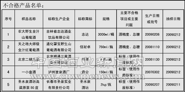 4月7日,吉林省長春市工商局公布了今年第一季度流通領域食品質量監測不合格結果,其中酒類產品問題依然突出。 長春市工商局根據國家工商總局《流通領域商品質量監測辦法》的規定,于2009年第一季度委托版權中國酒業新聞網吉林省食品工業產品質量監督檢測站對流通領域10